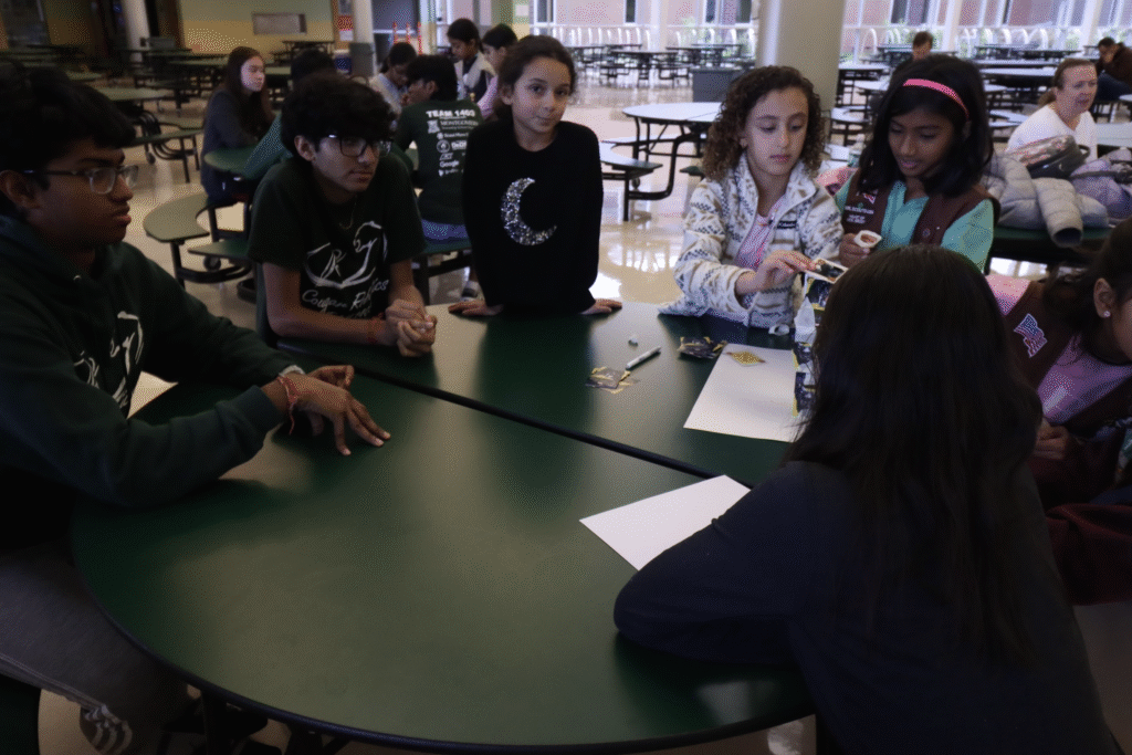 In Fall 2025, Team 1403 hosted a design challenge with local Girl Scout troops to promote teamwork and problem-solving. The troops were split into small groups and tasked with building a tower using only tape and cards, then predicting the final height of their structure. At the end of the challenge, Team 1403 members measured each tower, and the group whose tower height was closest to their prediction won. This activity introduced the Girl Scouts to fundamental STEM concepts and the engineering design process, while also teaching resilience and the importance of learning from failure.