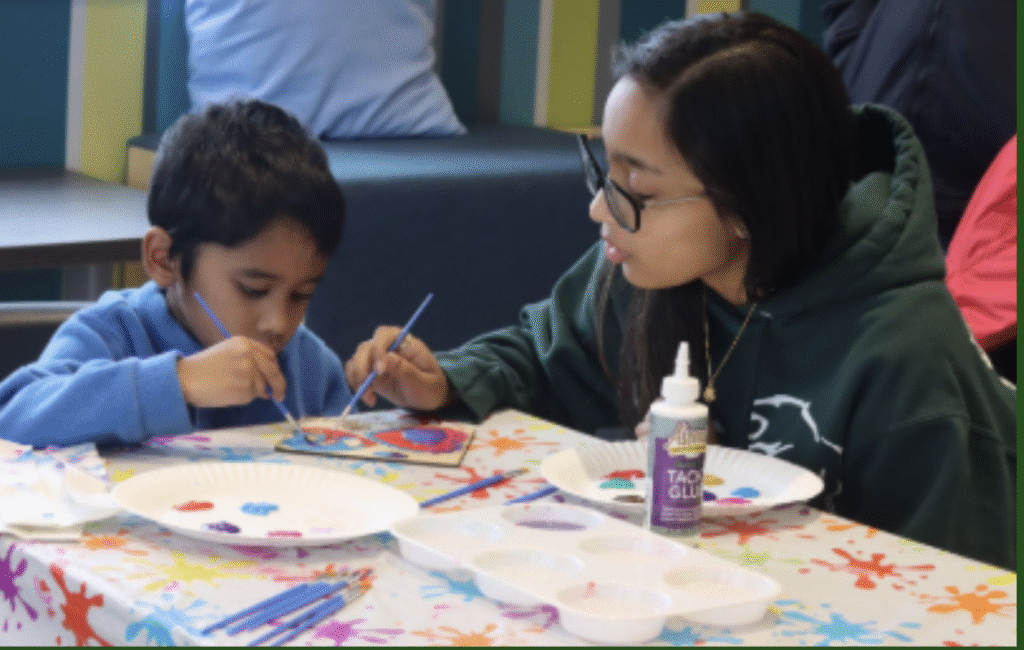 1403 has hosted various themed events at the Montgomery Library for families with kids aged 6 to 8. These children have fun with hands-on activities such as creating charming ornaments and wooden cutout puzzles. Through these artistic and creative activities, volunteers introduced families to STEM with intriguing and interactive presentations, showcasing SPIKE robots and highlighting the SOAR program.