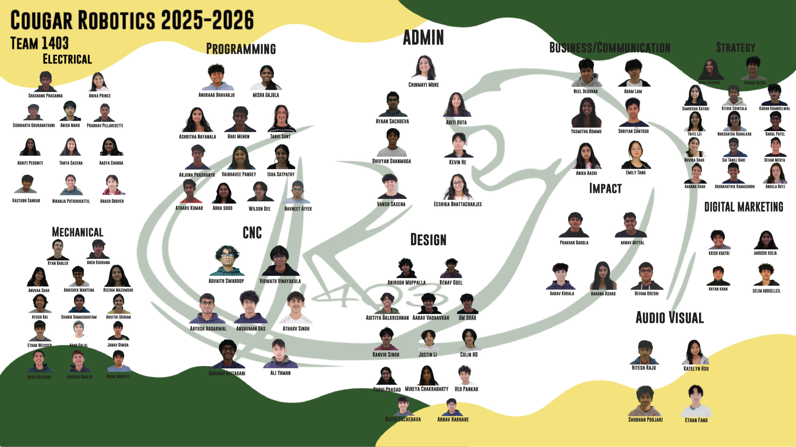 Audio/Visual Subteam: The A/V Subteam is responsible for photography and filmography such as visual documentation, graphic design, video production, and photo/video editing. They also document events by taking pictures and recording video clips. In addition to this, they create a photo board of the entire team, make the Team 1403 Chairman’s video, and take/edit photos that are posted on the team’s social media.